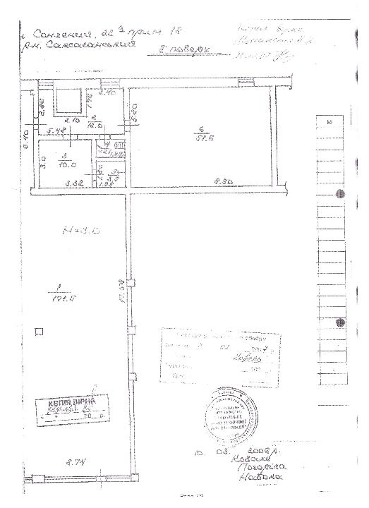Вбудоване в 2-й поверх двоповерхового нежитлового будинку. Складається з: торгівельний зал - 171,5 кв.м., коридор - 12,0 кв.м., підсобне приміщення - 10,0 кв.м., вбиральня - 2,1 кв.м., душ - 3,5 кв.м., вентиляція - 51,6 кв.м., крім того площа загального користування - 41,5 кв.м.