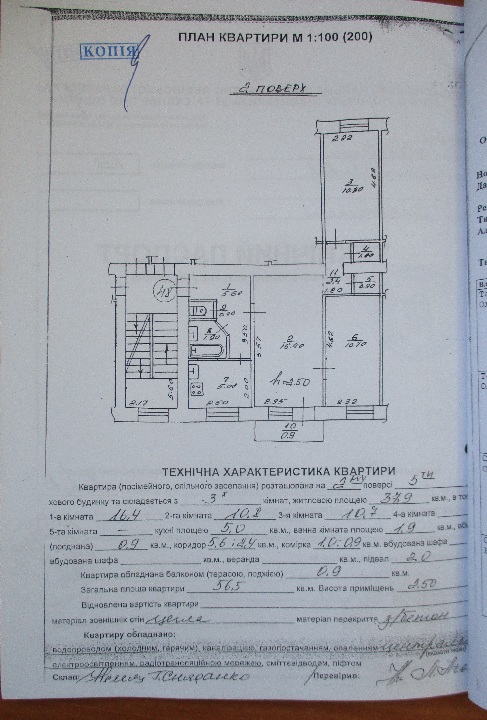 1/4 частки трикімнатної квартири загальною площею 56.5 м.кв. за адресою: м. Львів, вул. Тернопільська, 1, кв. 48. Складається з трьох житлових кімнат (1-ша кімната - 16.4 м.кв., 2-га кімната - 10.8 м.кв., 3-тя кімната - 10.7 м.кв.), кухні пл. 5.0 м.кв., ванної пл. 1.9 м.кв., вбиральні пл. 0.9 м.к.в, коридору пл. 5.6 м.кв. та 2.4 м.кв., балкону пл. 0.9 м.к.в, комірки пл. 1.0 м.кв. та 0.9 м.кв., підвалу пл. 2.0 м.кв. Квартира розташована на другому поверсі п'ятиповерхового житлового будинку. Фундаменти будинку бутобетонні стрічкові, стіни, перегородки - цегляні, перекриття - залізобетонні, дах, покрівля - рулонна, рубероїдна.