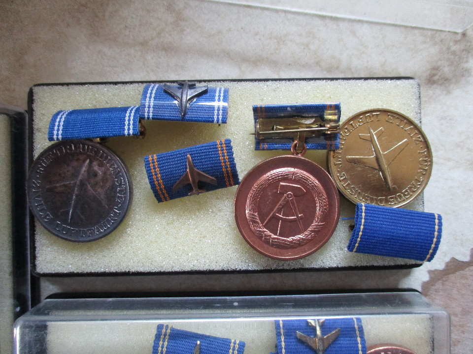Медаль (нагрудний знак) НДР із зображенням літака, 1-5 ступенів, в коробці та колодочками, 15 медалей, 15 колодочок, 6 коробок.