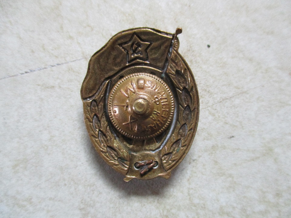 Нагрудний знак, в центрі якого є зображення двох перехрещених навхрест гвинтівок, зверху над якими зображено прапор червоного кольору