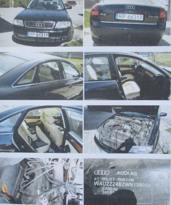 Транспортний засіб марки AUDI A6, 1998 року випуску, реєстраційний номер RP66319, № куз. WAUZZZ4BZWN136033, синього кольору, об'єм двигуна - 2496 см. куб., дизель, пробіг - 370636. Автомобіль без видимих пошкоджень кузова. Відомості про наявність/відсутність технічної документації та ключів відсутні.