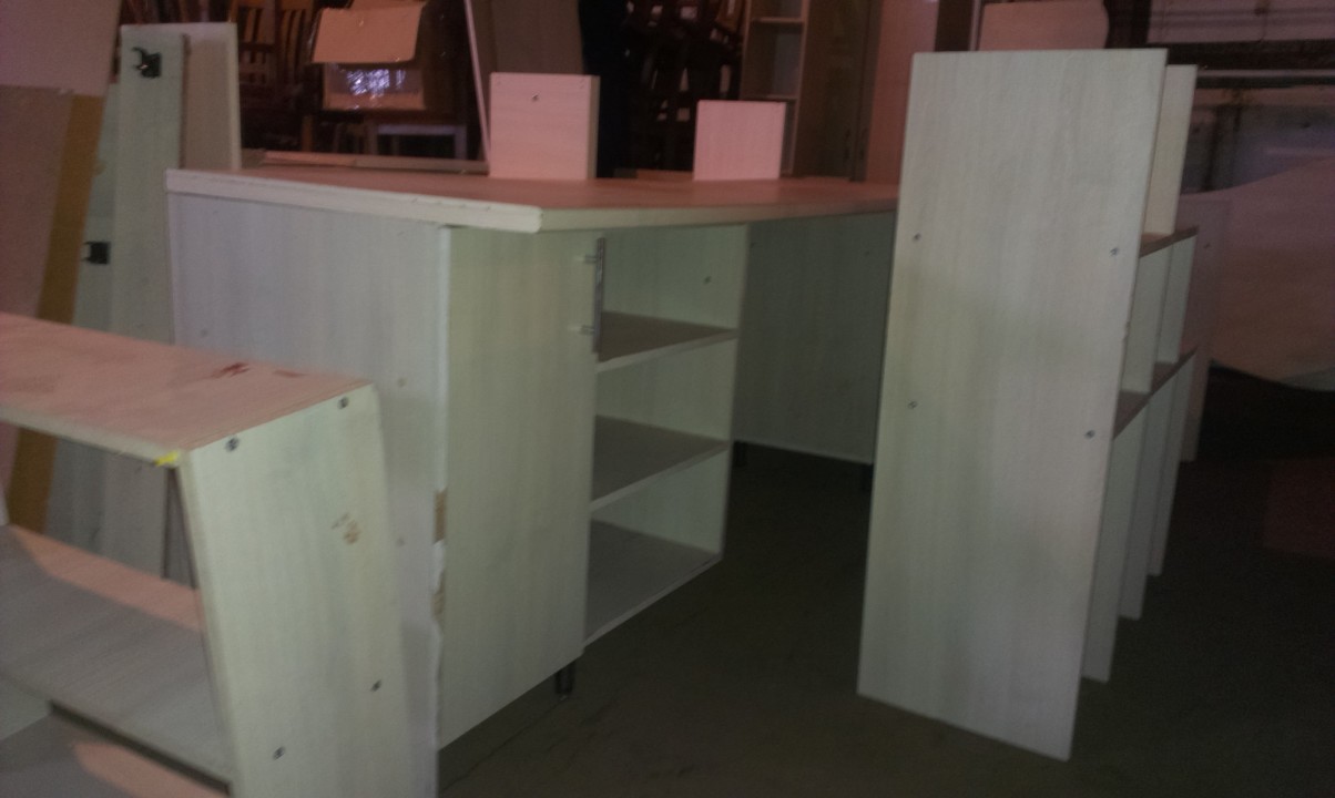 Стіл комп’ютерний, кутовий стільниця з одного боку овальної форми, матеріал ДСП, світлого кольору з тумбочками, б/к, крайкування пошкоджене, кріплення стільниці відламане, відсутня ніжка однієї тумбочки, стіл в розібраному стані