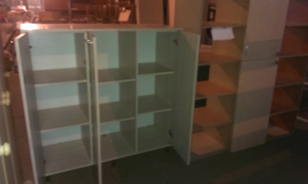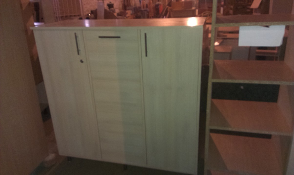Тумба трьох дверна світло-бежевого кольору, матеріал ДСП, на ніжках, розміром 120х48х120 см., одна дверка на замок -ключ відсутній, наявні знаяні подряпини на поверхні та пошкодження крайкування, 2 ніжки відламані, б/к
