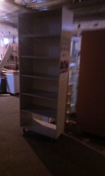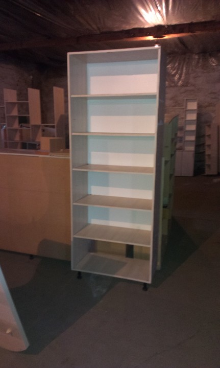 Шафа – вітрина світло-бежевого кольору, матеріал ДСП, розміром 215х80х40, з п'ятьма полицями, дверцята відсутні, б/к, наявні незначні пошкодження крайкування