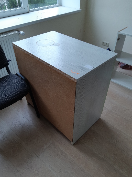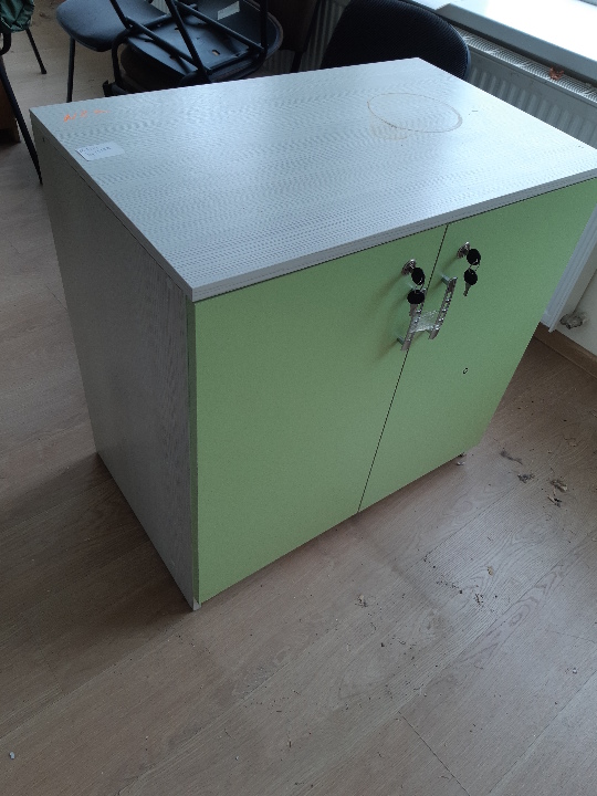 Офісна тумбочка, двох дверна на замок, матеріал ДСП, біло-зеленого кольору, розміром 80х50х80, б/к, на поверхні наявні подряпини та відколи покриття