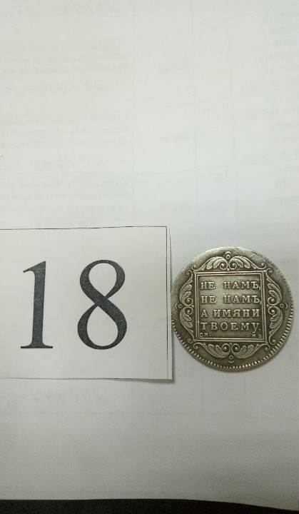 Монета з металу сріблясто-білого кольору, аверс-напис в квадраті "НЕ НАМ НЕ НАМ", реверс малюнок хреста з римською цифрою І та написом 1798, гурт гладкий.