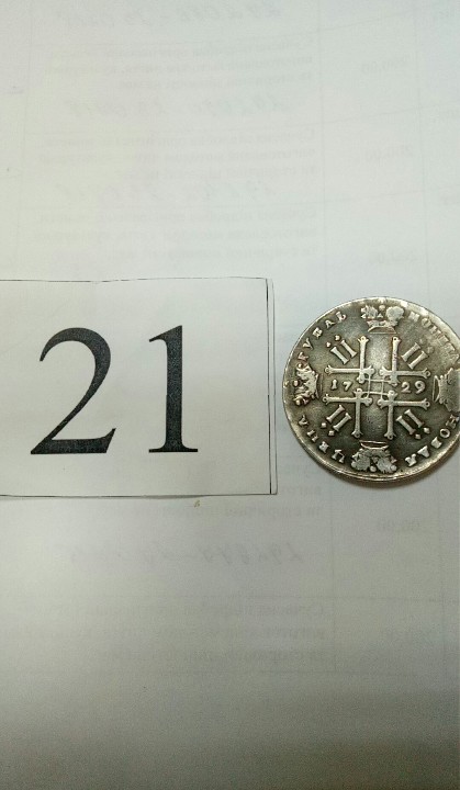 Монета з металу сріблясто-білого кольору, аверс-портрет чоловіка з нечітким написом навколо, реверс малюнок хреста з римською цифрою ІІ та написом 1729, гурт гладкий.