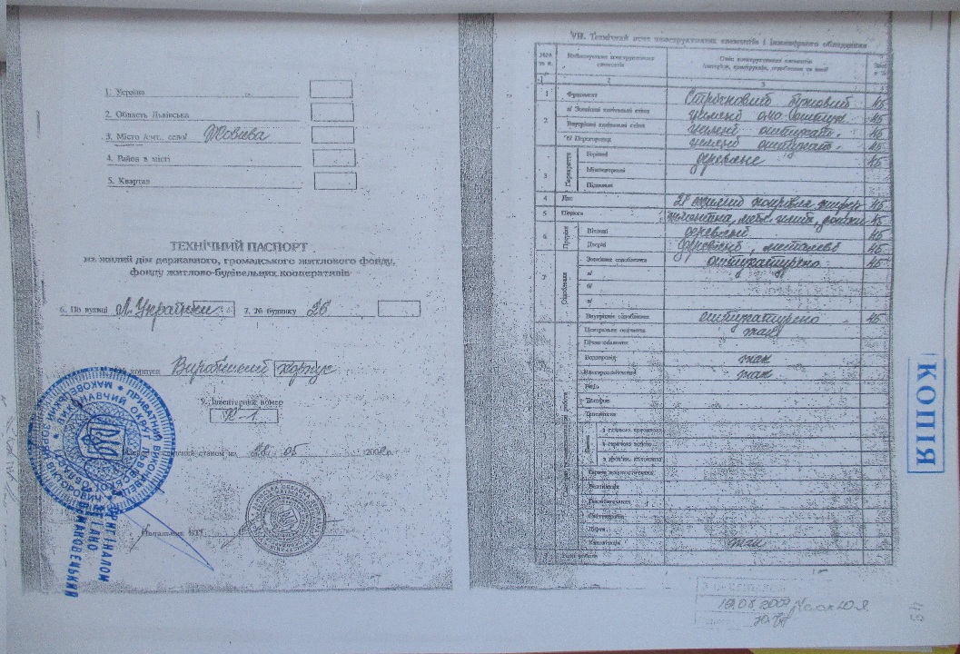 Нежитлова будівля, позначена на плані літ. А-1, заг. пл. 1559.0 м.кв., реєстраційний номер майна 14894538, що знаходиться за адресою: Львівська обл., м. Жовква, вул. Лесі Українки, буд. 26/8. Стіни - цегляні, покрівля - шифер, перекриття - дерево. Двері та вікна відсутні, покрівля та стіни частково зруйновані. Складається з п'яти приміщень пл. 64.6 м.кв., 234.9 м.кв., 77.7 м.кв., 141.6 м.кв., 18.3 м.кв. Майно належить боржнику на підставі Свідоцтва про право власності ЯЯЯ 509255 від 29.05.2006, виданого виконкомом Жовківської міської ради на підставі рішення від 25.02.2010 №241.