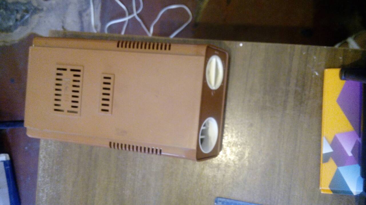 Електрофен марки "Весна" пластиковий корпус коричневого кольору, у робочому стані.