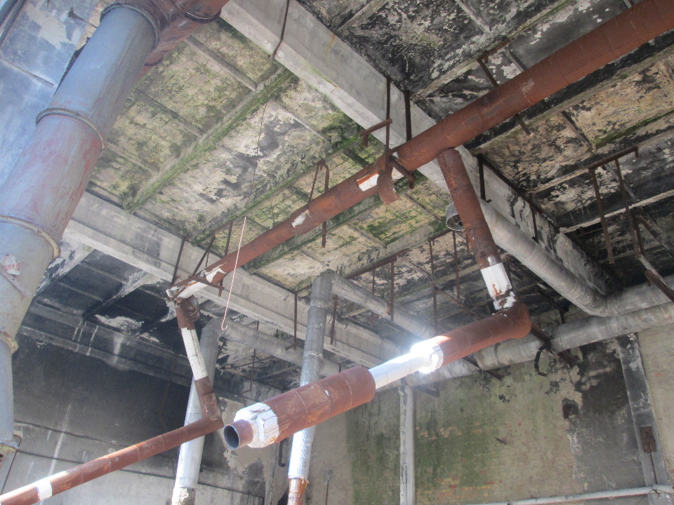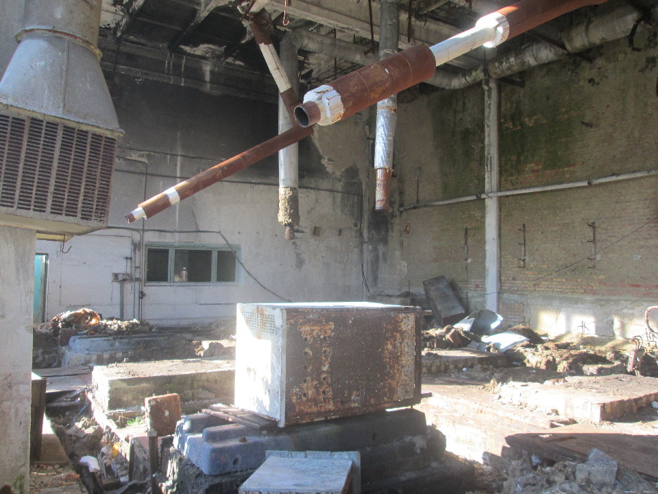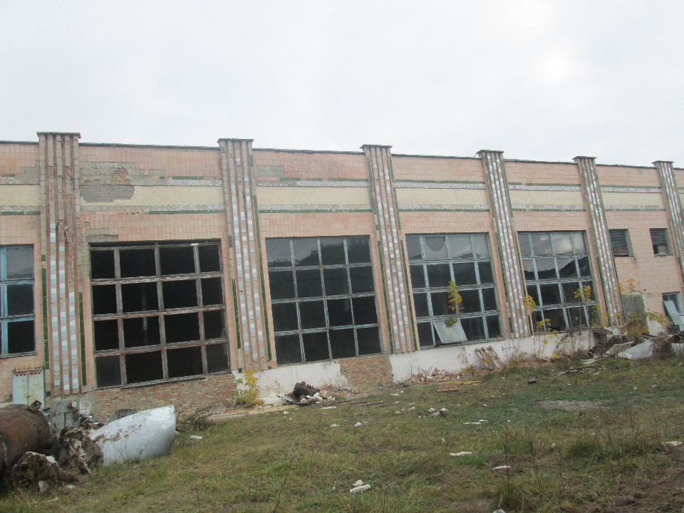 Одноповерхове приміщення, загальною площею 3890,1 кв.м, Будівельний об’єм нежитлової будівлі 37233 м куб. Рік вводу в експлуатацію 1982, Фундаменти – бетонні стрічкові. Тріщини у цокольній частині будівлі. Стіни – цегляні, з/б панелі, оштукатурені. Глибина тріщин і відпадання штукатурки місцями, вивітрювання розчину зі швів, ураження грибком. Перегородки - цегляні. Тріщини в місцях примикання перегородок, відколи. Перекриття – з/б панелі, покриття рулонне. Значне пошкодження та місцями повне знищення покриття. Покрівля- рулонне. Викривлення металевих жолобів, послаблення кріплень окремих елементів. Підлоги – цементні. Вікна – дерев’яні: перекіс рам, ураження гниллю, місцями- повна відсутність. Є окремі несправності, що не впливають на експлуатацію елемента і усуваються під час ремонту. Двері – відсутні. Внутрішні системи інженерного устаткування – повна відсутність. Інші роботи - ганки: бетонні, мають тріщини.