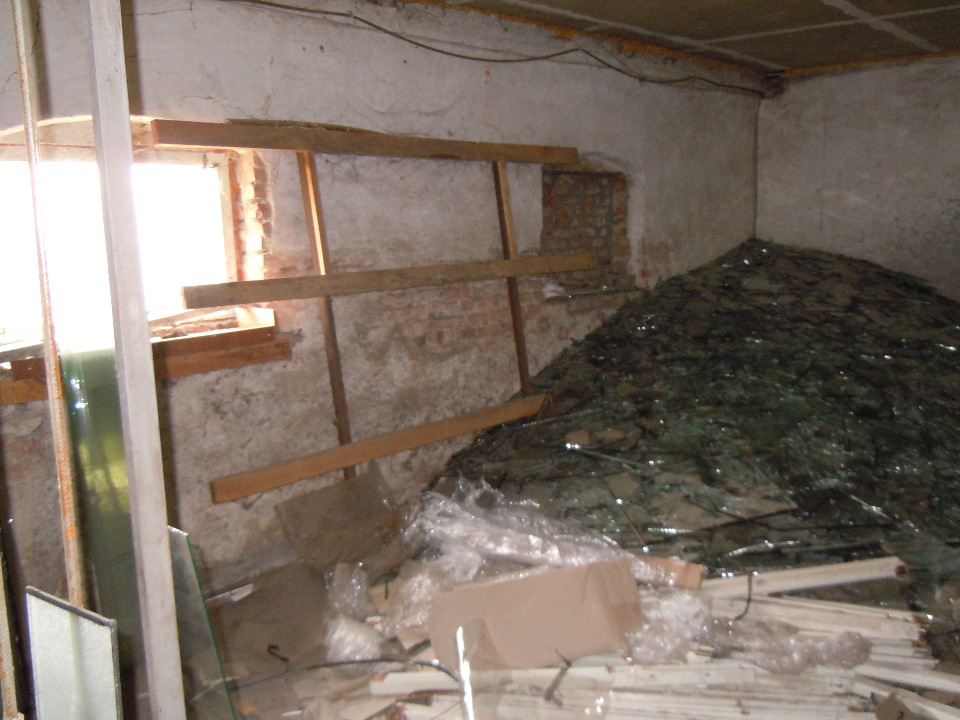 - підлога-цементна (стирання поверхні в місцях ходіння, вибоїни до 0,5 м.кв. на площі 25 %);