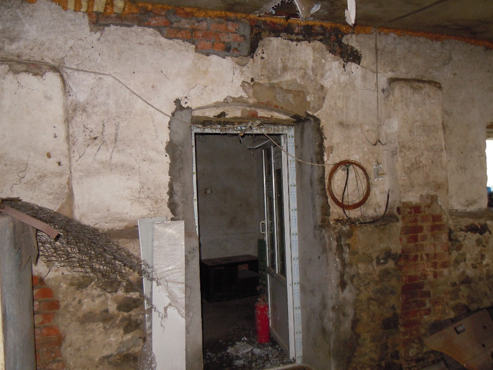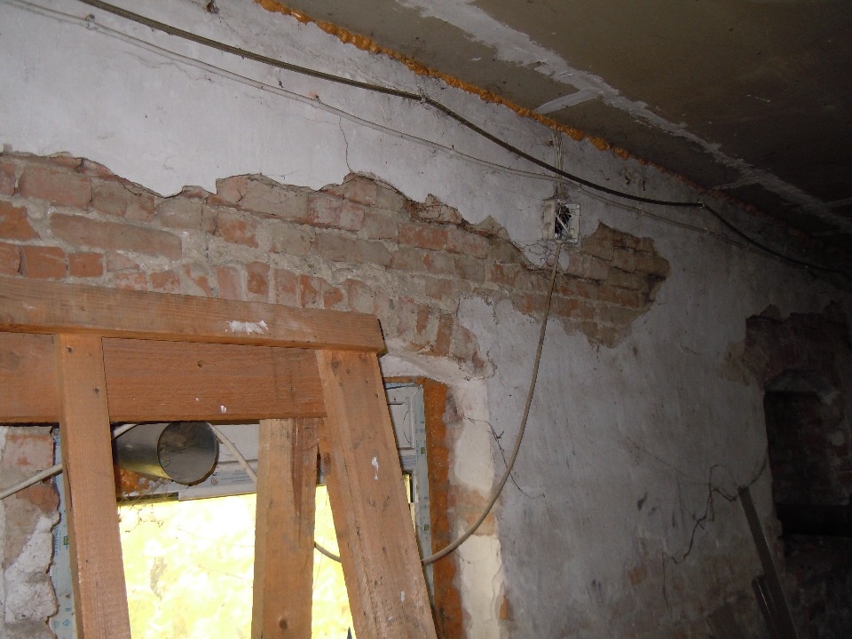 - стіни, перегородки-цегляні (глибина тріщин і відпадання штукатурки місцями, вивітрювання розчину зі швів, тріщини в місцях примикання перегородок до стелі, поодинокі відколи;