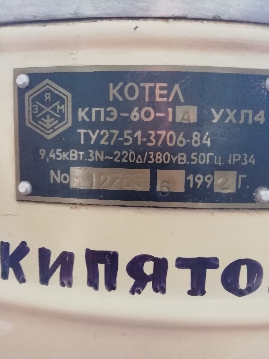 Котел харчоварильний електричний КПЕ-60-1, 1992 року випуску, заводський №12765, інв. №458355, б/в. Перекидний харчоварильний котел встановлений на чавунній вилкоподібній станині за допомогою двох цапф, які закріплені на зовнішній стороні корпуса котла. Котел складається з варильного котла, виготовленого з нержавіючої сталі й зовнішнього корпуса. Зовнішній корпус покритий теплоізоляцією та облицьований листовою сталлю. Замкнутий простір між варильним котлом й зовнішнім корпусом створює пароводяну сорочку, на знімальному дні якої змонтовані три тени й встановлені електроди захисту тенів від "сухого ходу". Технічна характеристика: робочий об'єм котла - 60 л., час розігріву - 0.75 год., потужність в період розігріву - 8.0 кВт, потужність в період варки - 1.33 кВт, кількість тенів - 3 шт., розміри - 945х640х1100, вага - 105 кг. Стан - задовільний.