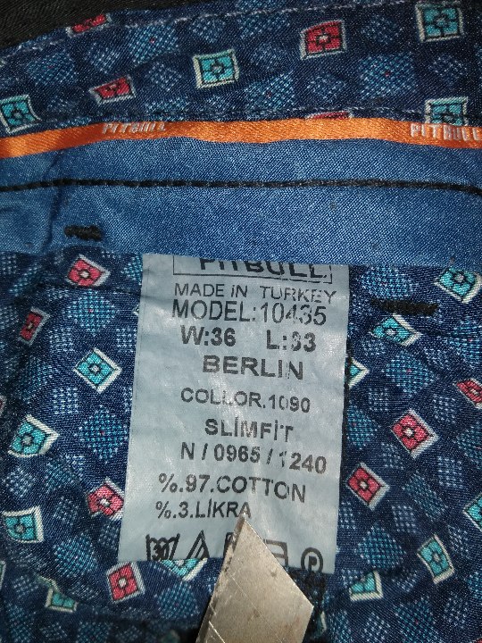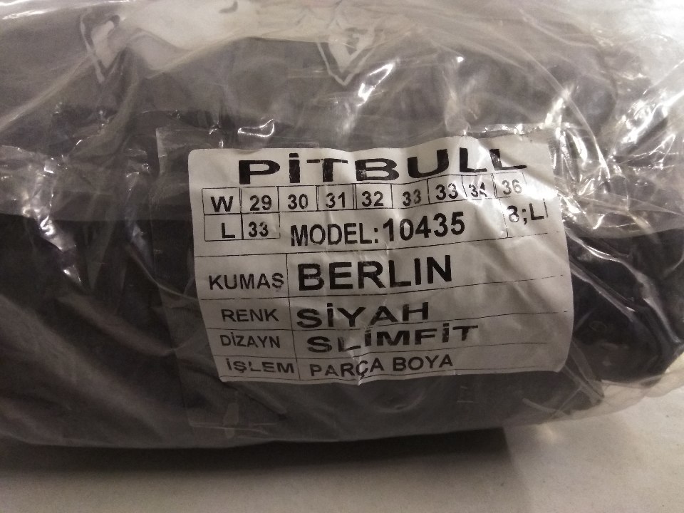 Штани чоловічі в асортименті, різних кольорів, упаковані в індивідуальну упаковку в кількості 25 одиниць. Наявні надписи на ярлику: "Pitbull.Men's wear". Розміри: 33-42. Маркування українською мовою відсутнє.