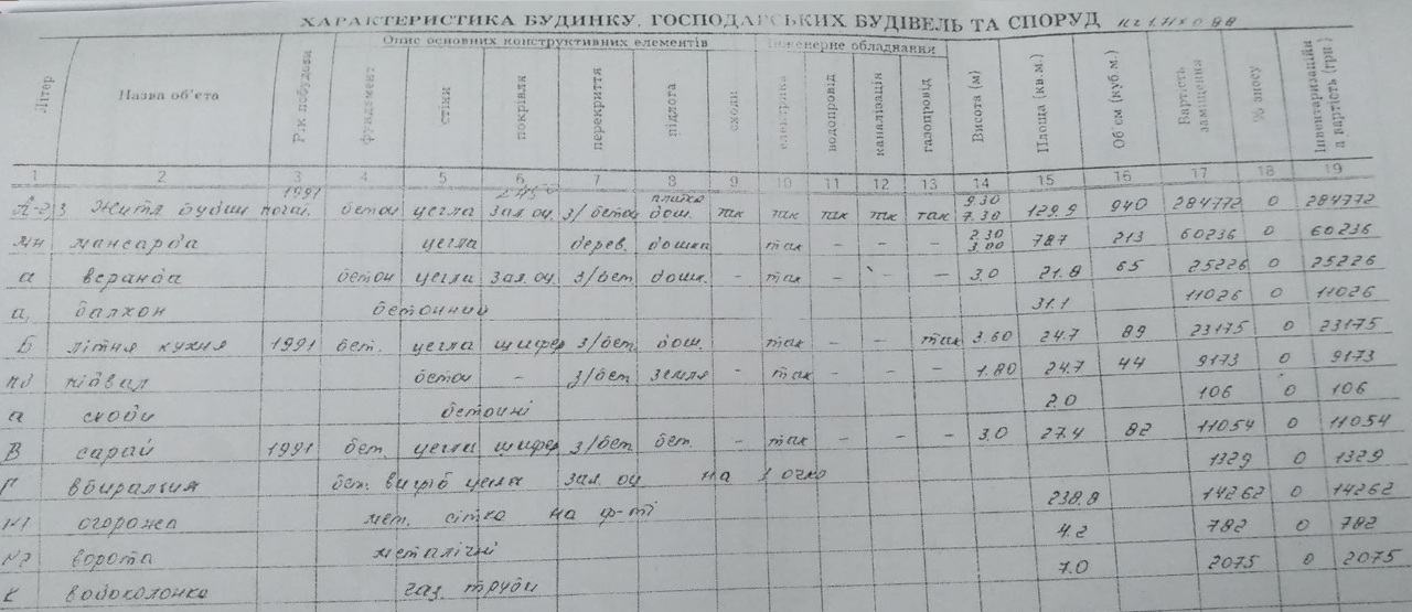 Будинковолодіння заг.пл. 322.0 кв.м., житловою площею 120.3 кв.м., літня кухня Б, сарай В, вбиральня Г, огорожа 1, ворота 2, водо колонка К, реєстраційний номер майна - 18132591, та земельна ділянка пл. 0.15 га для будівництва та обслуговування житл.буд., к.н. 4625380900:01:017:0006, за адресою: Львівська обл., Стрийський р., с. Добрівляни, вул. Довга, 28л. Трьохповерховий будинок який складається з: 1-ий поверх: коридор – 9,4кв.м., хол – 26,7кв.м., кухня – 10,7кв.м., кладова – 6,3кв.м., кухня-їдальня – 16,0кв.м., коридор – 1,1кв.м., туалет – 1,8кв.м., ванна – 7,1кв.м., котельня – 4,9кв.м., коридор – 5,1кв.м., гардеробна – 6,9кв.м., гараж – 18,1кв.м., 2-й поверх: коридор – 28,0кв.м., житлова кімната – 11,5кв.м., житлова кімната – 23,1кв.м., кладова – 5,5кв.м., житлова кімната – 21,0кв.м., ванна – 14,6кв.м., 3-й поверх: коридор – 7,3кв.м., більярдна – 29,4кв.м., кладова – 12,2кв.м., коридор – 4,4кв.м., житлова кімната – 14,7кв.м., житлова кімната – 20,6кв.м., кладова – 5,4кв.м., кладова – 10,2кв.м. Літня кухня площею 24.7 кв.м., підвал - 24.7 кв.м., сарай - 27.4 кв.м. Рік побудови будинку 1991. Матеріал стін - цегла. Фундамент - бетон. Покрівля - бляха оцинкована/шифер. Перекриття - залізобетон/дерево. Будинок обладнаний електро-, газо-, водопостачанням, каналізацією. Огорожа виконана з металевої сітки, ворота металеві, водоколонка - труби.