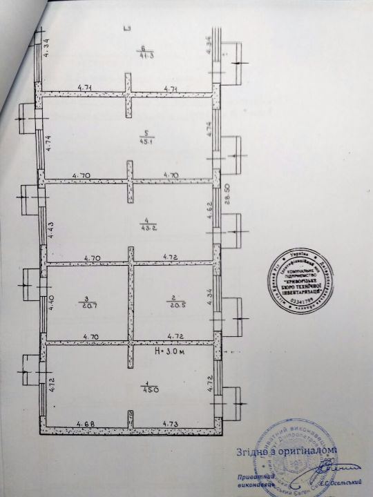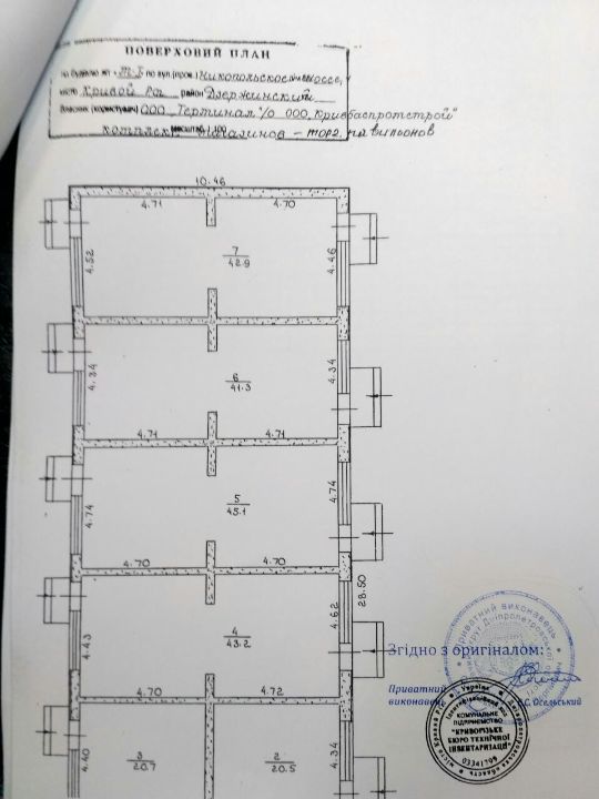 Одноповерхова нежитлова будівля літ. М-1 загальною площею 258,7 кв.м. складається з: магазин - 45,0 кв.м., магазин - 20,5 кв.м., магазин - 20,7 кв.м., магазин - 43,2 кв.м., магазин - 45,1 кв.м., магазин - 41,3 кв.м., магазин - 42,9 кв.м.