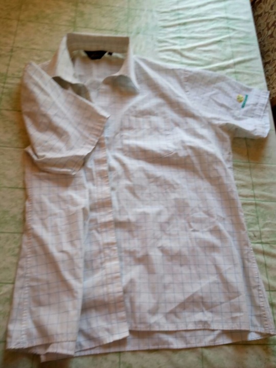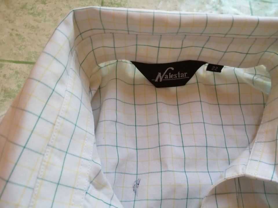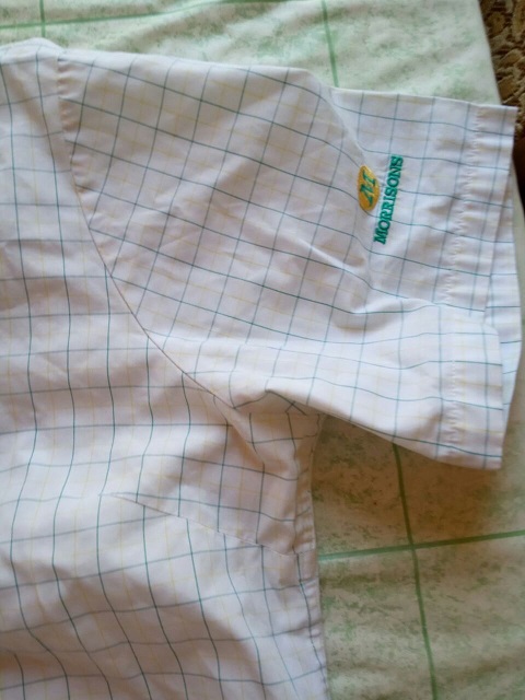 Сорочка жіноча білого кольру в зелену та жовту клітинку, рукав короткий, на лівому рукаві вишивка у вигляді букви "М" та напису "MORRISONS", розмір 22, виробник Nalestar.