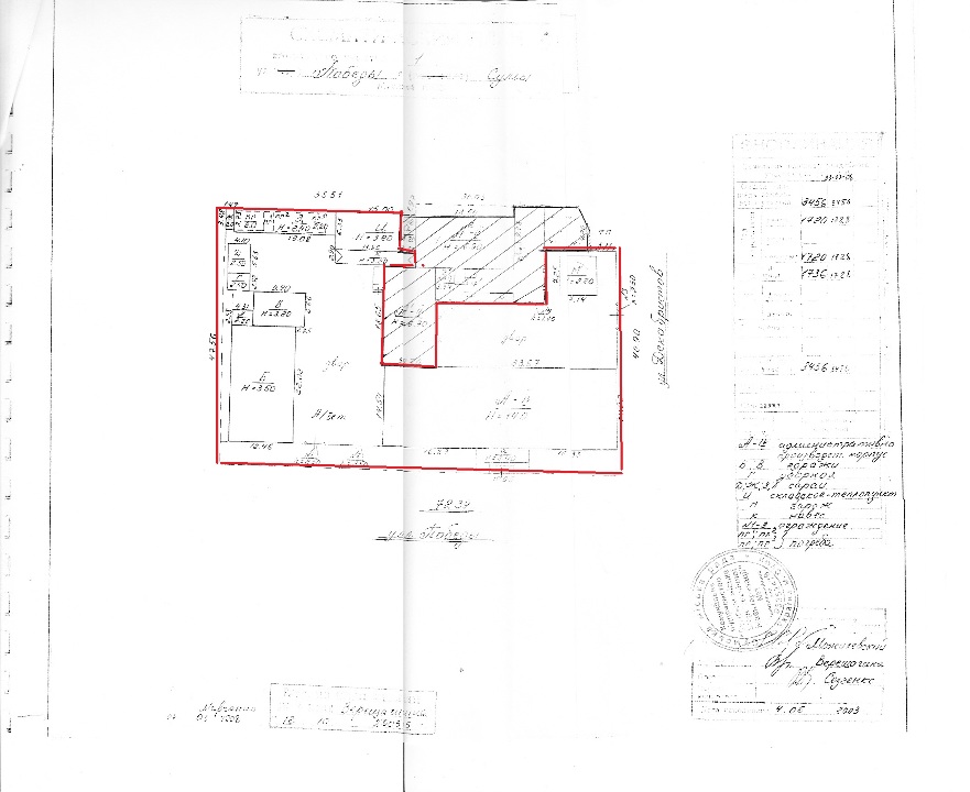 ІПОТЕКА. Адмін.-вироб. корпус літ.А-ІV, пл. 2057,2 кв.м., теплопункт зі склад. при-ми пл. 59,9 кв.м., гараж пл. 234,6 кв.м, гараж пл. 52,8 кв.м., сарай пл. 55,3 кв.м. з погрібом, сараї, навіс, вбиральня, огорожа 1-3, за адресою: м. Суми, вул. Перемоги, 1