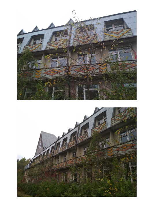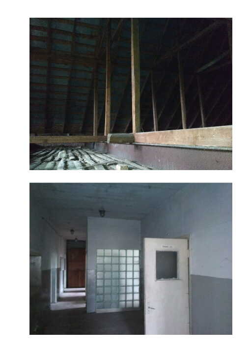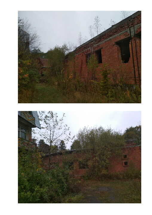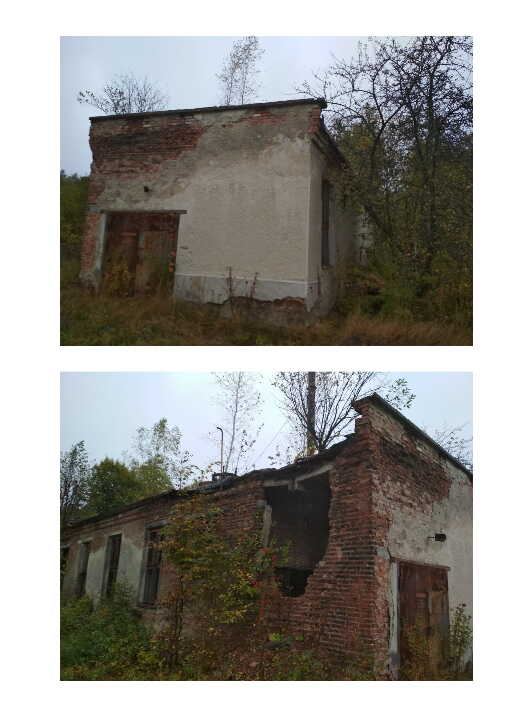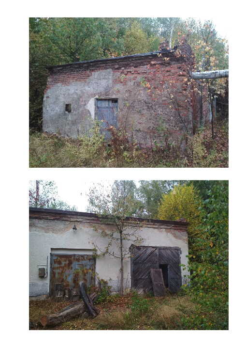 Котельня-гаражі літ. "В". Матеріали стін цегла, Покрито залізобетонними плитами. Напівзруйновані.