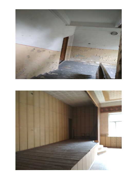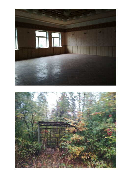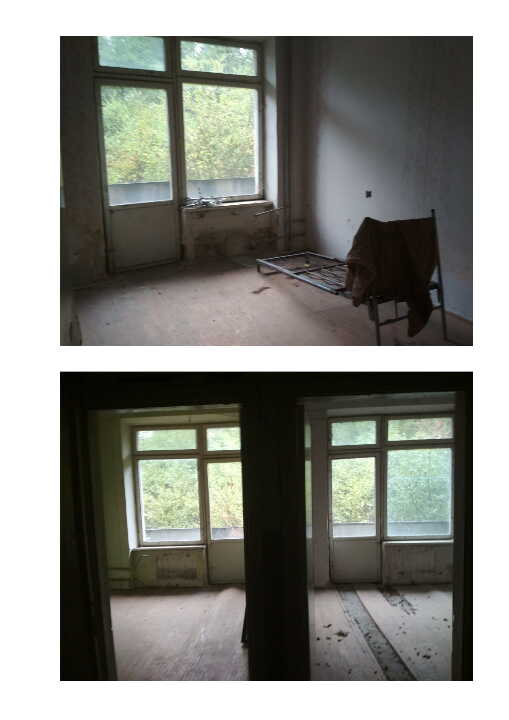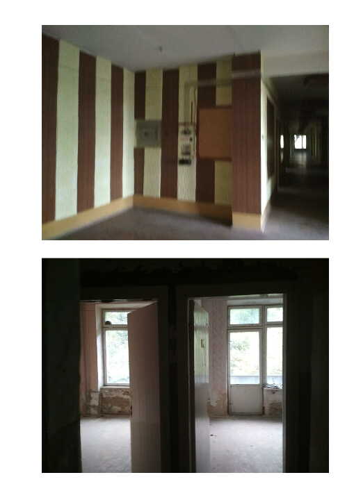 Санаторій літ. А. Перший поверх: підлога - декоративна стяжка з мраморною крошкою, в кімнатах частково паркет, частково плитка ПВХ, в господарських приміщеннях – керамічна плитка; стіни цегляні, в коридорах спорядження з гіпсових плит, в столовій деревяні панелі та гіпсові плити, в інших приміщеннях штукатурка з пофарбуванням та частково керамічна плитка, стан спорядження – сильно пошкоджений; Другий поверх: підлога – паркет, стіни в кімнатах – штукатурка, фарбування, стан спорядження – сильно пошкоджений; Третій поверх: підлога – паркет, стіни в кімнатах – штукатурка, фарбування, стан спорядження – сильно пошкоджений; покрівля санаторію – залізно-оцинкована. Система опалення електрики, водопостачання відсутні. Вікна деревяні, рами засклені, частково пошкоджені.