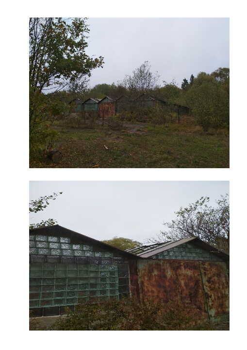 Теплиця літ. "Б". Матеріали стін склоблоки. Частково зруйновано.