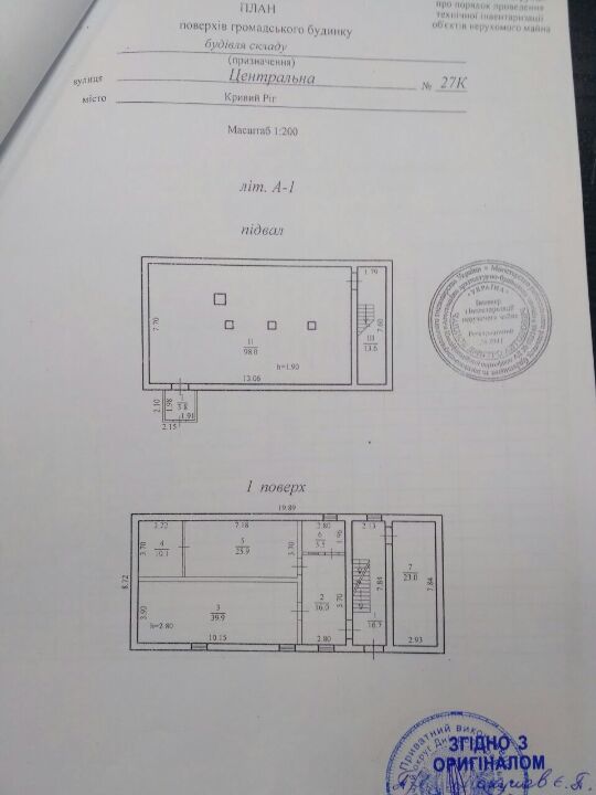 - підвал: тамбур - 3,8 кв.м., приміщення - 98,0 кв.м., приміщення - 13,6 кв.м., всього по підвалу 115,4 кв.м.;