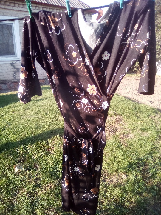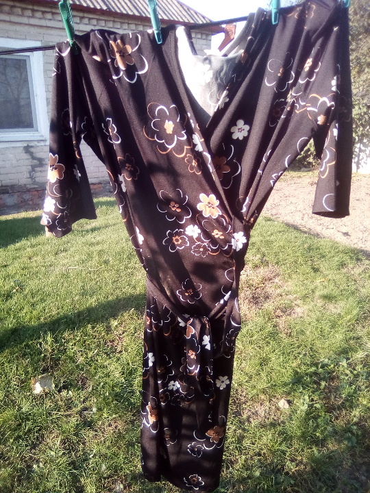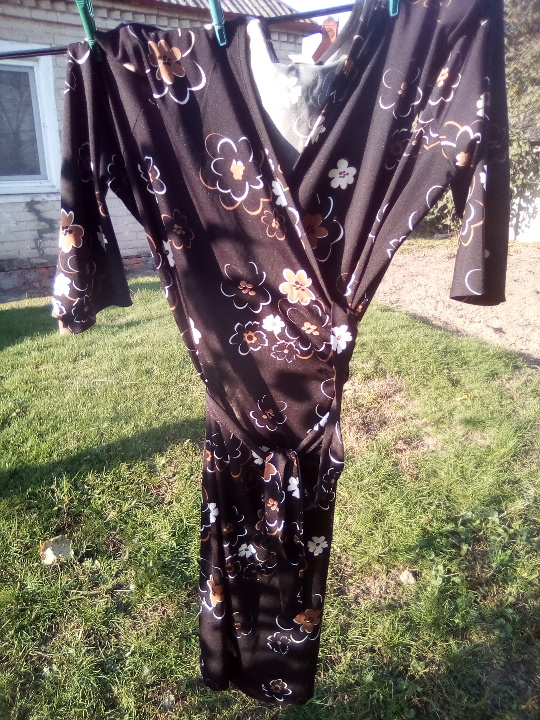 сукня жіноча, чорного кольору, з V образною горловиною, рукав 1\3 чверть, з квітковим принтом по всій довжині виробу, матеріал виробу 85 % віскоза, 15 % акрил в доброму стані без видимих дефектів та потертостей, розмір 48-50